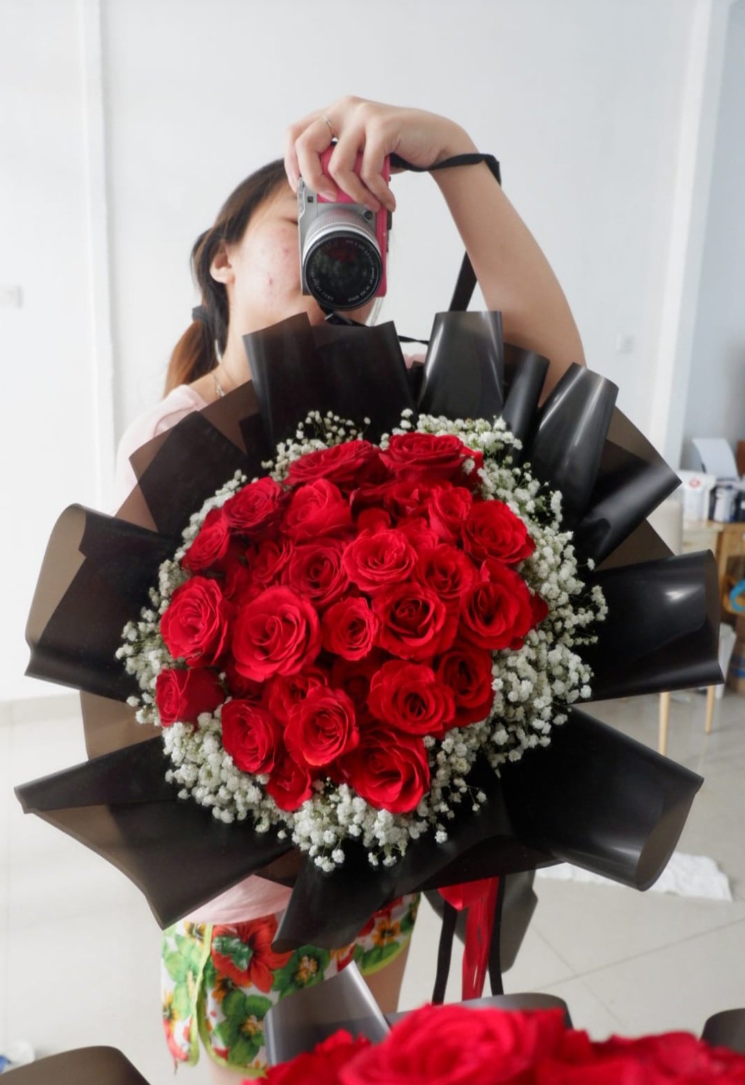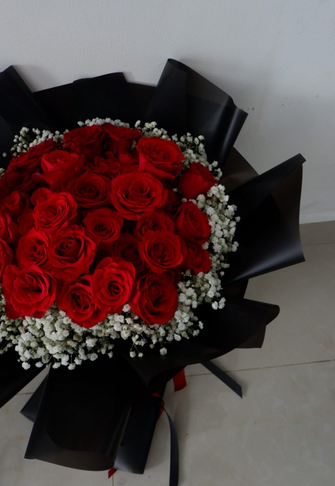 Roses arrange in round shape classic style, surrounded by classic baby breath