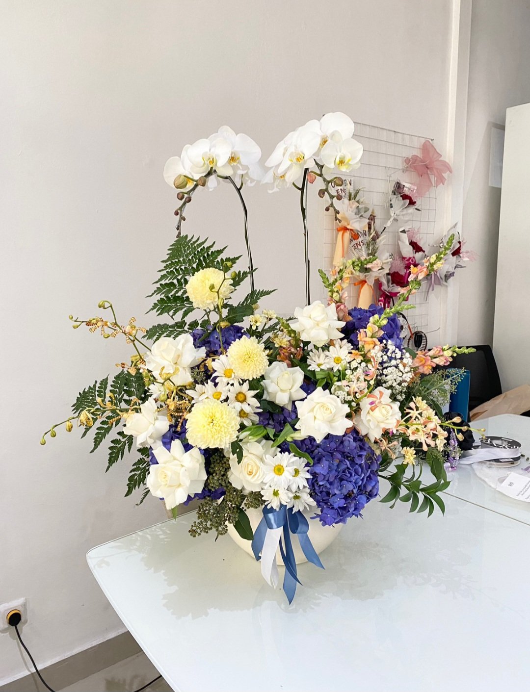 The perfect blend of flowers makes foa a beautiful sight. Its modern and elegant with our Orchids and other flowers. This Vase is perfect for your special moment.