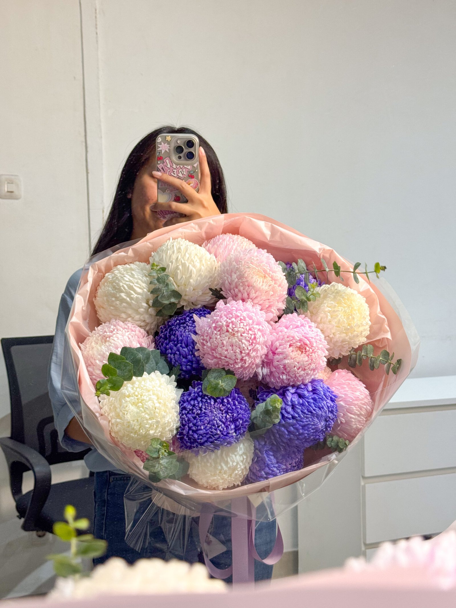 Accented with fresh eucalyptus foliage and wrapped in delicate, high-quality paper, this bouquet delivers a sophisticated visual balance; perfect for those who appreciate understated beauty with a modern, upscale touch. The rounded form of each chrysanthemum symbolizes abundance, longevity, and sincere affection, making this arrangement ideal for heartfelt gifting.