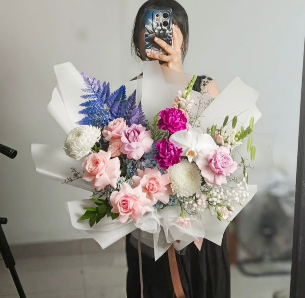 Premium flower, ingredient(s) Rose, Dianthus, Aiko, Snapdragon, Baby breath, Hydrangea.